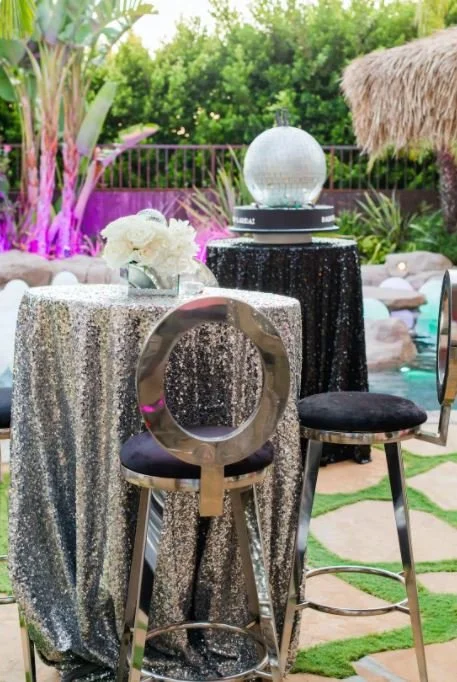 Looking to have a party that is a little less dinner and a little more dancing? Host your own disco with colorful uplights, radiant white dance floor and lots of sparkles!