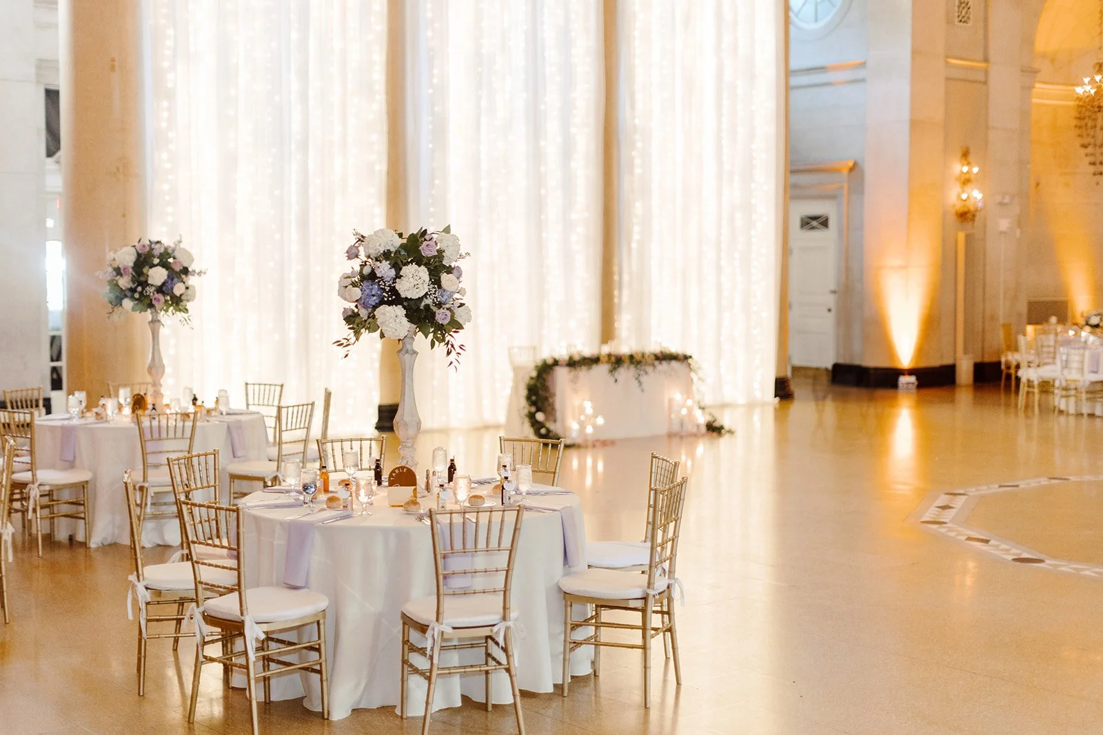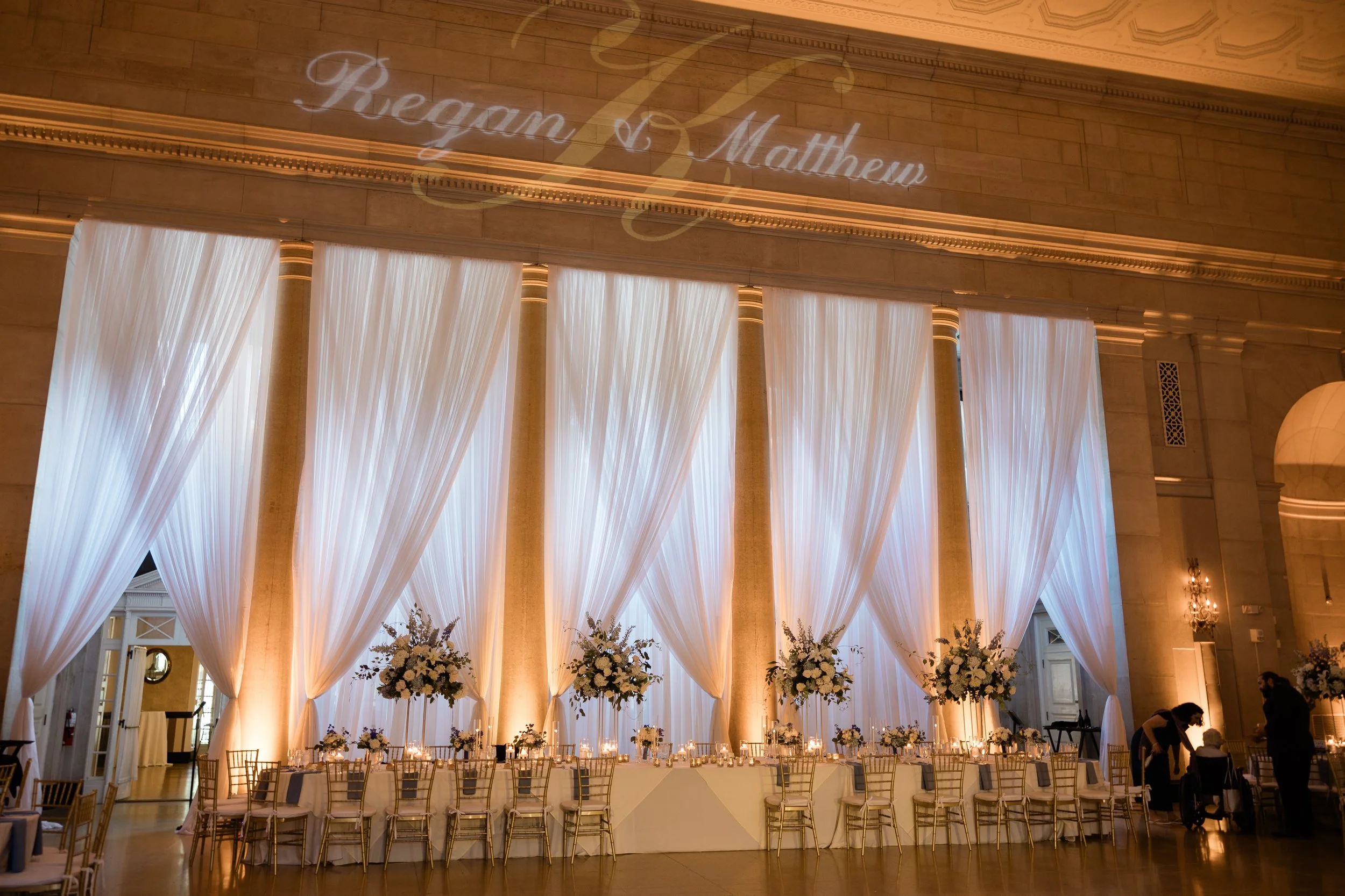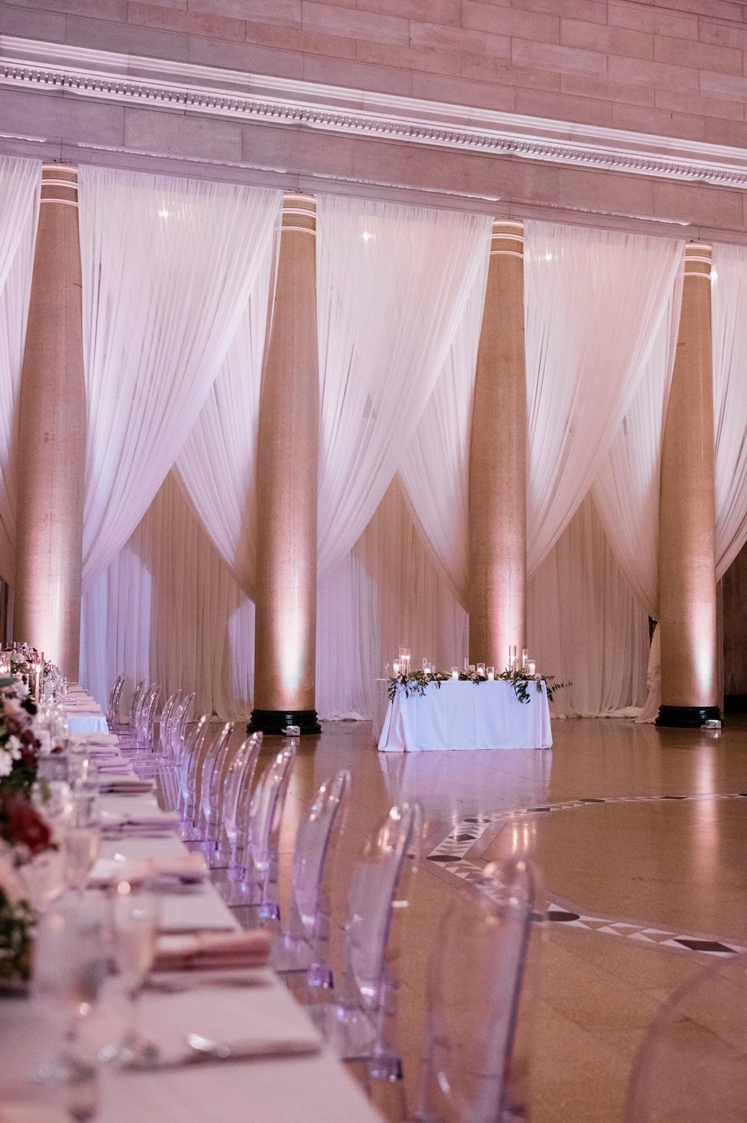 Elevate your space with criss-cross chiffon backdrops, illuminated uplighting, drape behind the bad, drapery tunnel, ceiling treatment in the bar patio. Choose from gold Chiavari chairs, black Chiavari chairs, or ghost chairs to match your aesthetic.