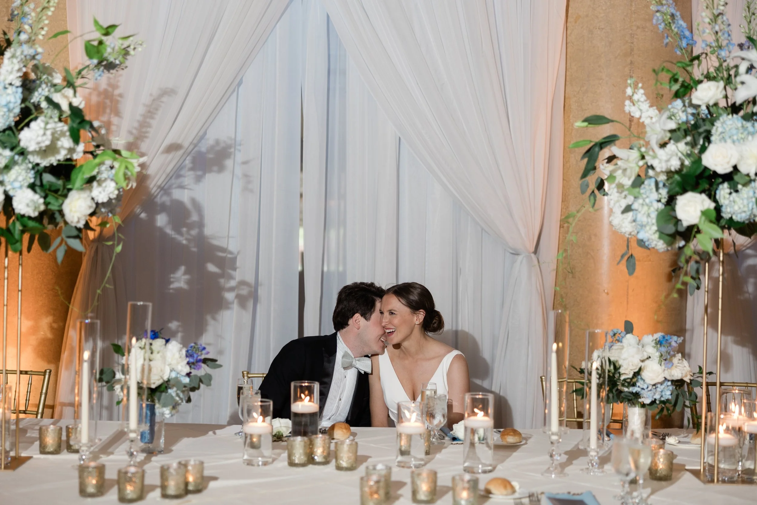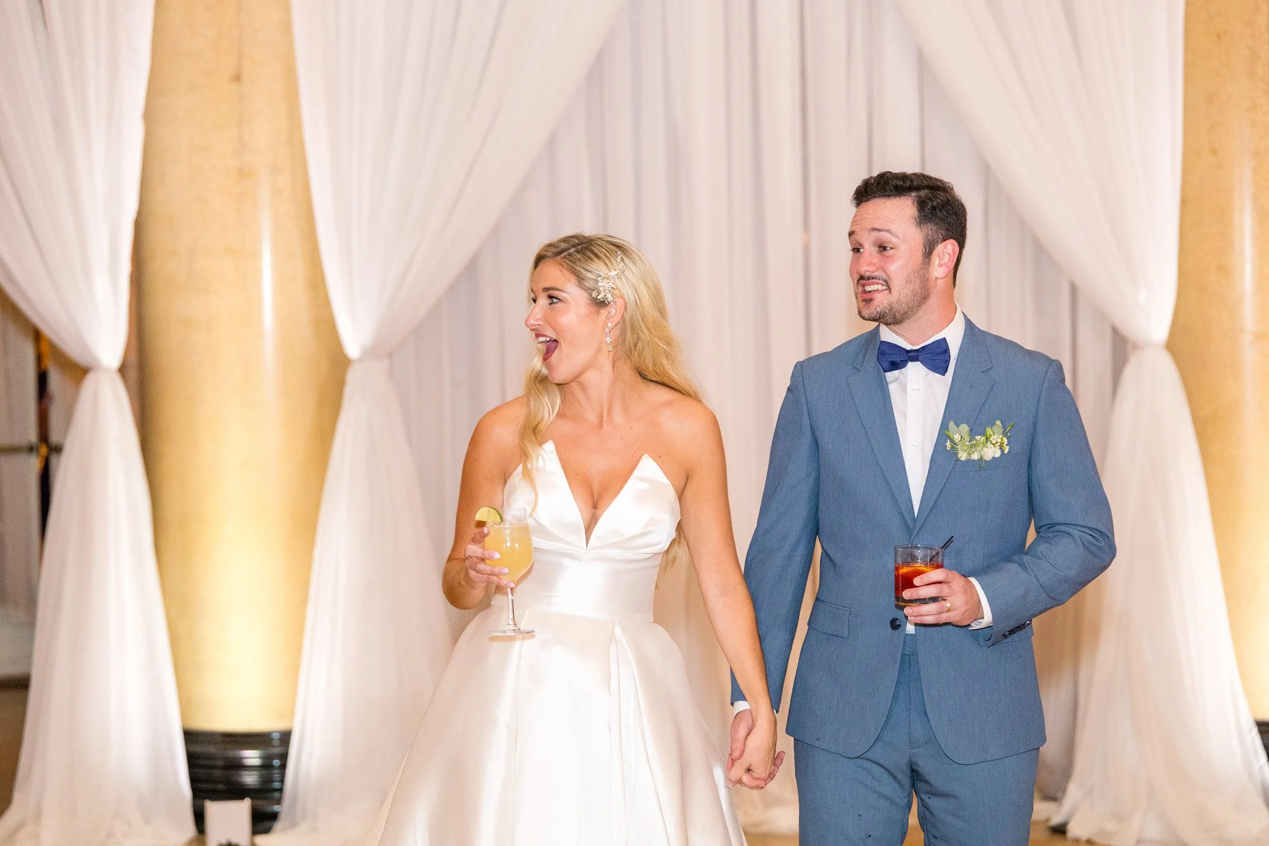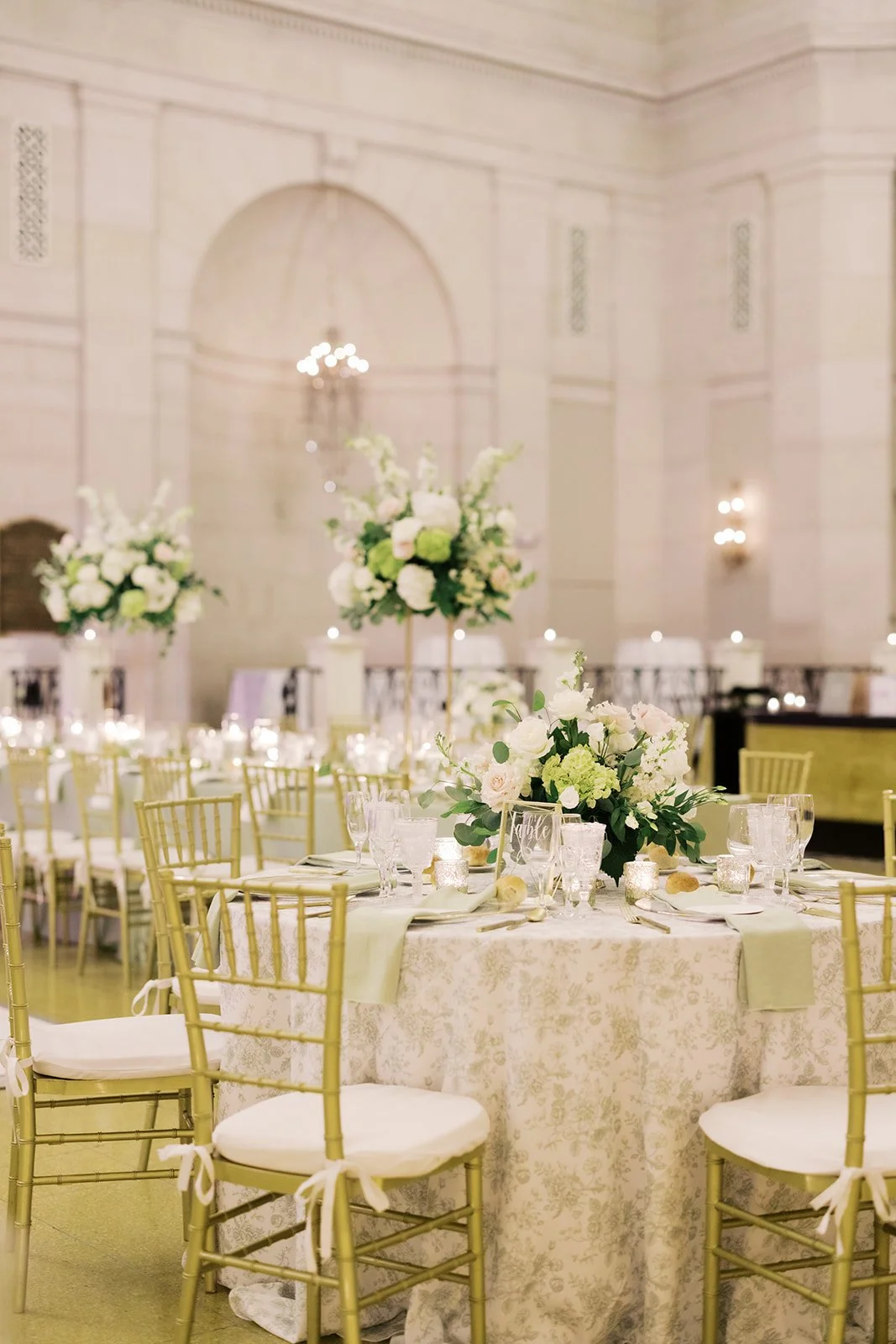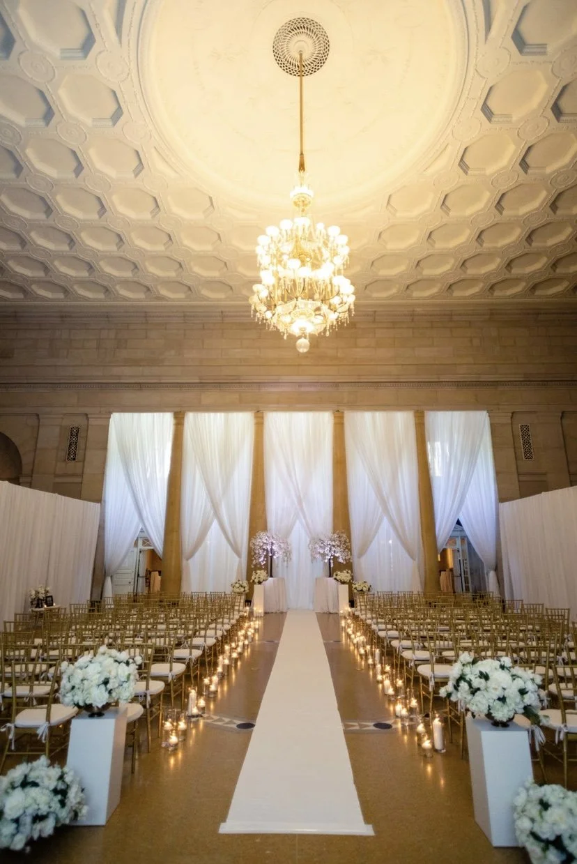 Elevate your space with criss-cross chiffon backdrops, illuminated uplighting, drape behind the bad, drapery tunnel, ceiling treatment in the bar patio. Choose from gold Chiavari chairs, black Chiavari chairs, or ghost chairs to match your aesthetic.