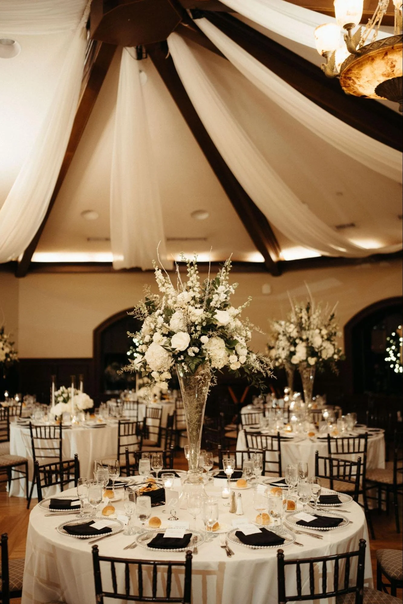 The ballroom at Saratoga National is known for its dramatic and elegant design. Total Events specializes in chiffon ceiling swags, custom dance floors, and room drapery as signature features. The ballroom ambiance can be elevated with upgraded linens, uplighting, and tableware. With 25 years of experience, Total Events can take any inspo board and use the beauty of the ballroom to make your vision come to life.