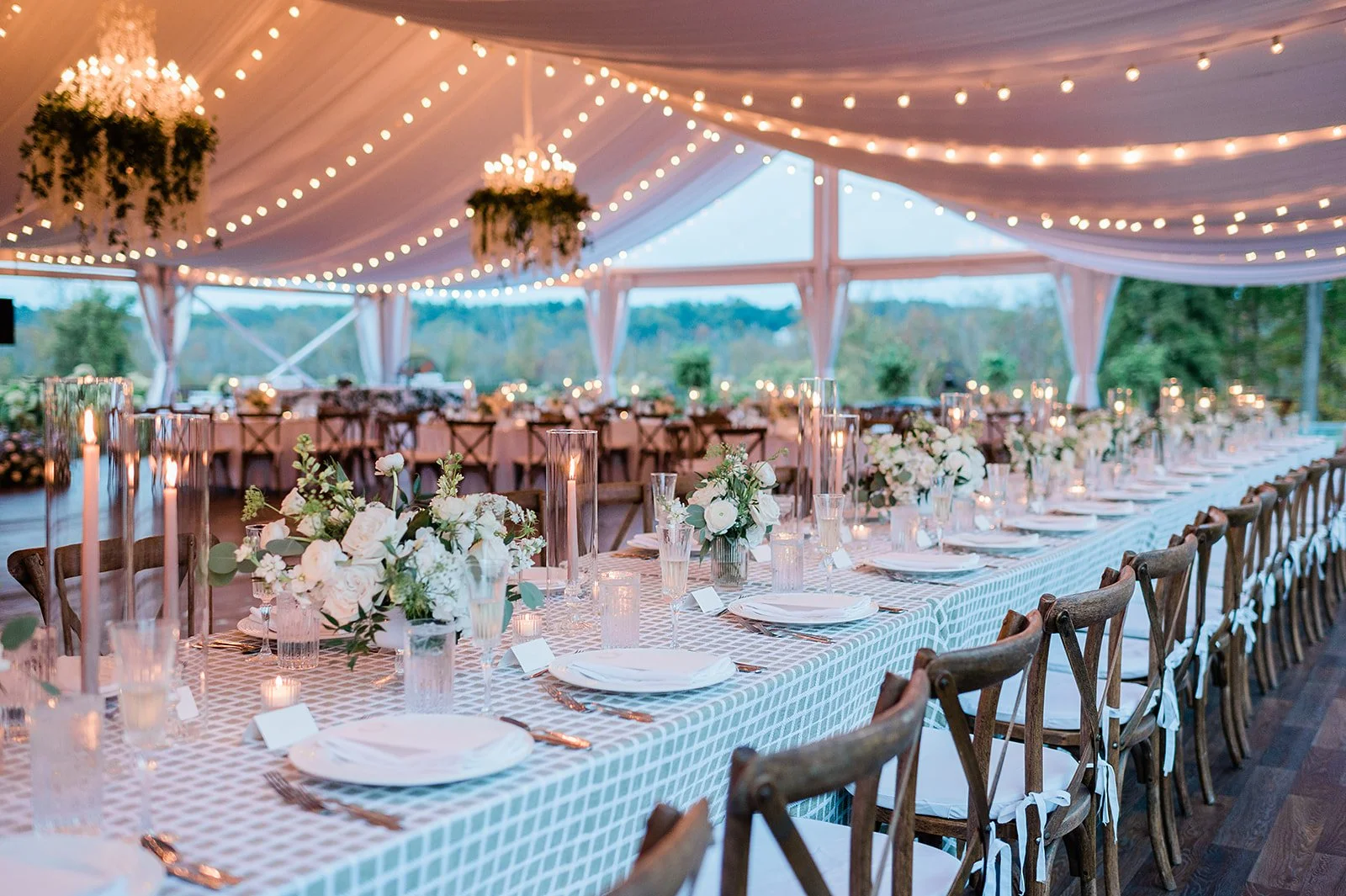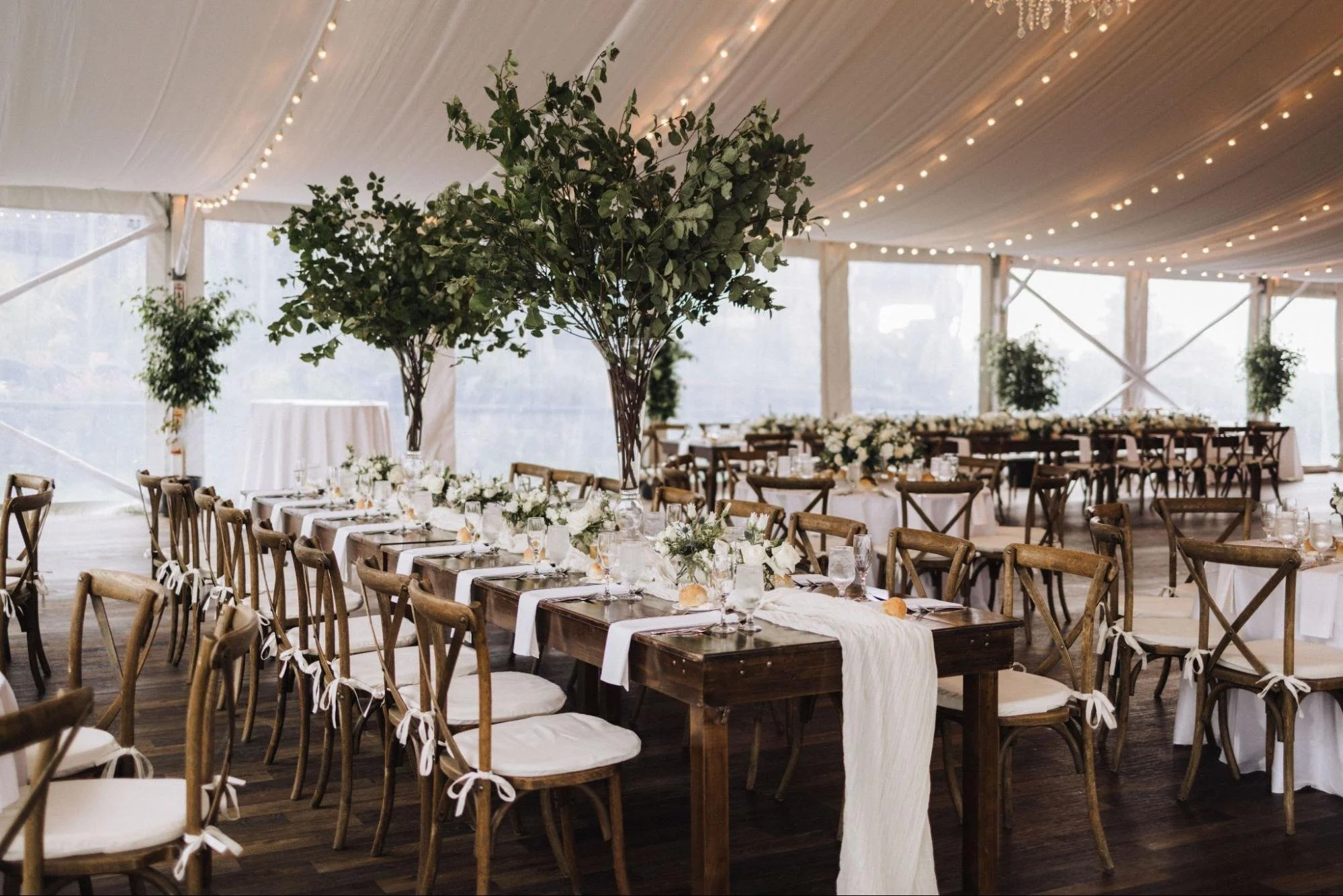 For outdoor receptions, bring personality to the tent with X-back chairs, chiavari chairs, or plush lounge furniture to match your aesthetic. Pair these with colorful table settings, including upgraded linens, statement chargers, and luxury flatware. Looking for a bold dance floor? Choose from classic wood to custom checkered patterns (and everything in between!).