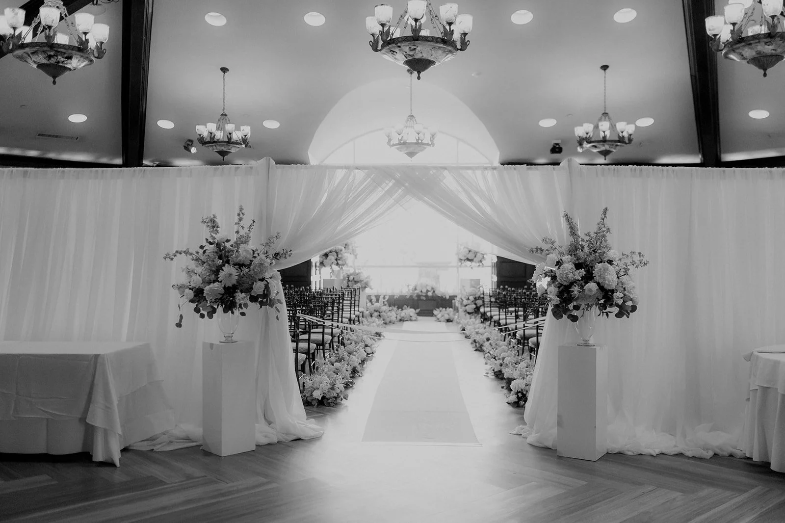 Elevate the ballroom with chiffon drapery, uplighting, a custom dance floor, and elegant tableware. Rainy day? No problem! Total Events can transform the ballroom into a stunning ceremony space with our ceremony drape design, creating the perfect reveal for any bride.